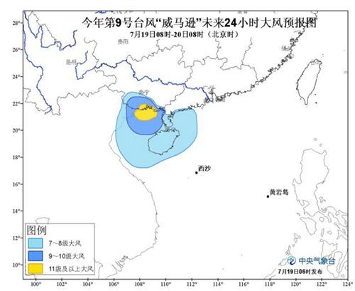 19日08時(shí)至20日08時(shí),南海西北部、瓊州海峽、北部灣以及海南沿海、廣東西部沿海、廣西南部及沿海將有7-9級(jí)大風(fēng),其中北部灣北部、廣東雷州半島西部沿海、廣西沿海將有10-12級(jí)大風(fēng),臺(tái)風(fēng)中心經(jīng)過(guò)的附近海域或地區(qū)的風(fēng)力有13-15級(jí),陣風(fēng)可達(dá)16-17級(jí);海南大部、廣東西南部、廣西南部和西部、云南東南部等地有暴雨或大暴雨,其中,廣西南部等地的局部地區(qū)有特大暴雨(250-400毫米)。