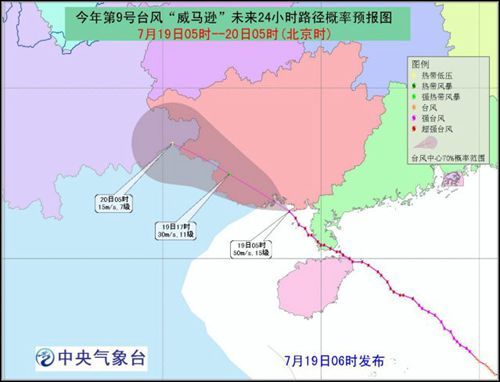 人民網(wǎng)北京7月18日電 中央氣象臺(tái)7月19日6時(shí)繼續(xù)發(fā)布臺(tái)風(fēng)紅色預(yù)警:今年第9號(hào)臺(tái)風(fēng)“威馬遜”(超強(qiáng)臺(tái)風(fēng)級(jí))的中心已于18日19時(shí)30分前后在廣東省徐聞縣龍?zhí)伶?zhèn)沿海再次登陸,登陸時(shí)中心附近最大風(fēng)力仍有17級(jí)(60米/秒),中心最低氣壓為910百帕。今天早晨5點(diǎn)鐘“威馬遜”已減弱為強(qiáng)臺(tái)風(fēng)級(jí),6點(diǎn)鐘其中心位于廣西防城港東南近海海面,就是北緯21.5度、東經(jīng)108.8度,中心附近最大風(fēng)力仍有15級(jí)(50米/秒),中心最低氣壓為945百帕。