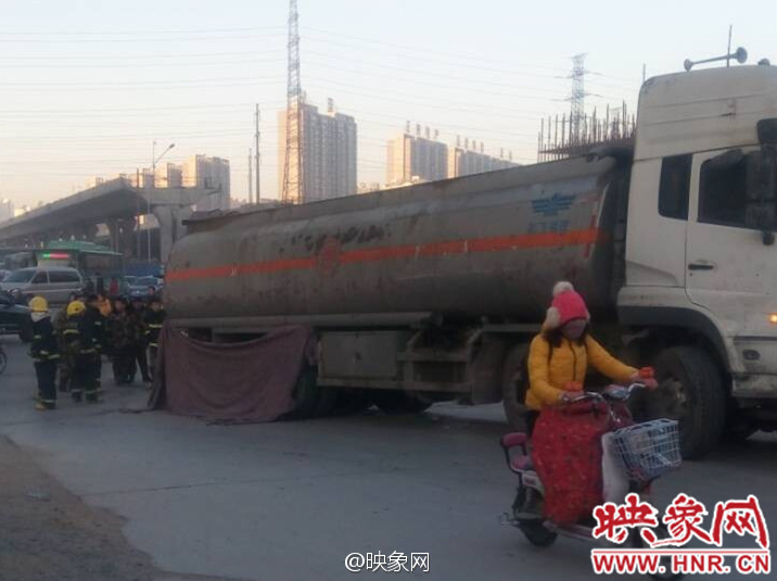今天(1月19日)早上7點(diǎn)20分左右,鄭州市中州大道航海路上,一輛油罐車將一騎電瓶車男子碾倒在車下,事故現(xiàn)場被布遮擋,估計很慘。目前罐車司機(jī)已被控制住,事故還在處理中。