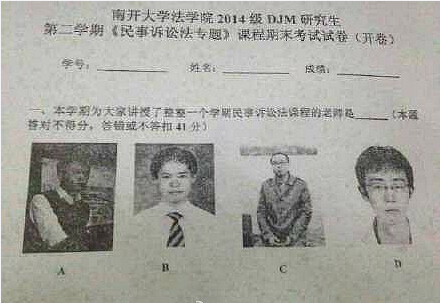 南開大學(xué)法學(xué)院某科目的期末試卷被學(xué)生上傳,瞬間引爆學(xué)生圈。同學(xué)們表示:“內(nèi)傷了”“臉盲怎么辦”“想想真的很有道理??!”…也有同學(xué)吐槽,“老師您用的是大學(xué)時候的證件照,現(xiàn)在不長這樣了…”這還真是一個刷臉的時代啊