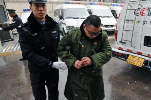 尹相杰頂著雪穿著綠色軍大衣被法警帶進(jìn)法院,等候?qū)徖怼3?yáng)法院供圖
