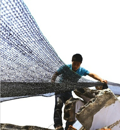 成堆的建筑垃圾高低不平,有的高達(dá)數(shù)米甚至10多米,在上面鋪防塵網(wǎng)并不是件容易的事。鋪防塵網(wǎng)的工人說,他們一天只能鋪1萬多平方米。鋪防塵網(wǎng)難度不小,還有很高的成本,讓人意想不到的是,竟然有人蓄意搞破壞。