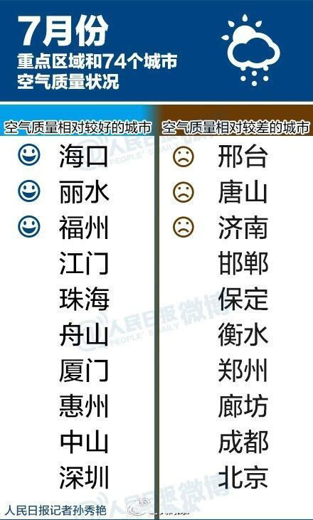 環(huán)保部今天發(fā)布7月城市空氣質(zhì)量狀況。空氣質(zhì)量相對較差的后10位:邢臺、唐山、濟(jì)南、邯鄲、保定、衡水、鄭州、廊坊、成都和北京;空氣質(zhì)量相對較好的前10位:???、麗水、福州、江門、珠海、舟山、廈門、惠州、中山和深圳。