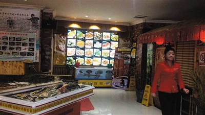 昨日,北岸野生漁村飯店一樓大廳內(nèi),鰉魚頭上放著手寫的價(jià)格標(biāo)簽,顯示每斤498元。 新京報(bào)記者 肖鵬 攝