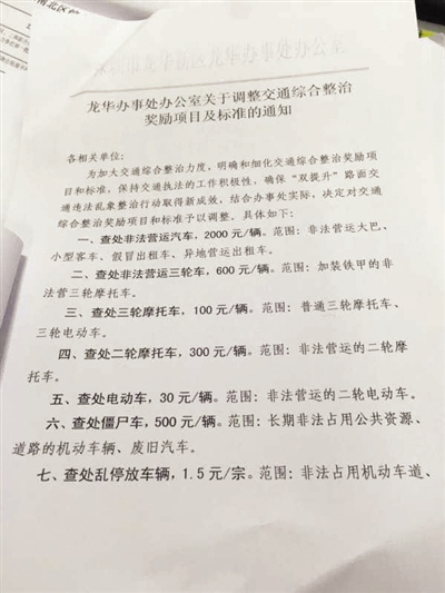 記者在一份由深圳龍華新區(qū)龍華辦事處辦公室出具的《關(guān)于調(diào)整交通綜合整治獎(jiǎng)勵(lì)項(xiàng)目及標(biāo)準(zhǔn)的通知》的文件中發(fā)現(xiàn),為加大交通綜合整治力度,明確和細(xì)化交通綜合整治獎(jiǎng)勵(lì)項(xiàng)目和標(biāo)準(zhǔn),保持交通執(zhí)法的工作積極性,辦事處決定對(duì)交通綜合整治獎(jiǎng)勵(lì)項(xiàng)目和標(biāo)準(zhǔn)予以調(diào)整,其中加裝鐵甲的非法營(yíng)運(yùn)三輪車(chē)每查處一輛獎(jiǎng)勵(lì)600元,普通三輪摩托車(chē)、三輪電動(dòng)車(chē)每輛獎(jiǎng)勵(lì)100元,對(duì)無(wú)證駕駛、妨礙執(zhí)法當(dāng)事人實(shí)施行政拘留的,拘留一人獎(jiǎng)勵(lì)500元。