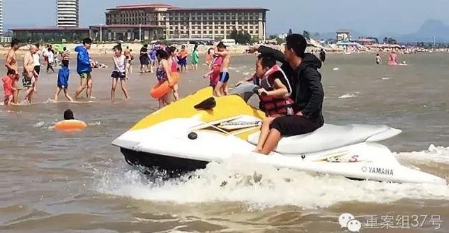 2016年8月20日,東戴河止錨灣,男子開(kāi)著摩托艇帶一名小游客游玩,正從一對(duì)母女倆身邊極速開(kāi)過(guò),引起驚呼。