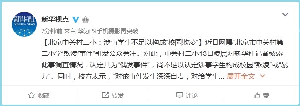 【北京中關(guān)村二?。荷媸聦W(xué)生不足以構(gòu)成“校園欺凌”】近日網(wǎng)曝“北京市中關(guān)村第二小學(xué)‘欺凌’事件”引發(fā)公眾關(guān)注。對(duì)此,中關(guān)村二小13日凌晨對(duì)新華社記者披露此事調(diào)查情況,認(rèn)定其為“偶發(fā)事件”,尚不足以認(rèn)定涉事學(xué)生構(gòu)成校園“欺凌”或“暴力”。同時(shí),校方表示,“對(duì)該事件發(fā)生深深自責(zé),對(duì)給學(xué)生及家長帶來的傷害,深表歉意”,將汲取教訓(xùn),以此為鑒,本著認(rèn)真理性、客觀公正的原則,妥善處理。(新華社記者魏夢(mèng)佳、梁天韻)