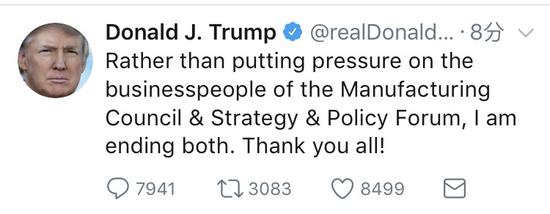 特朗普在推文中寫道:“與其給制造業(yè)顧問委員會和戰(zhàn)略與政策論壇的商人們施加壓力,我倒不如將它們都關閉,謝謝你們所有人!”