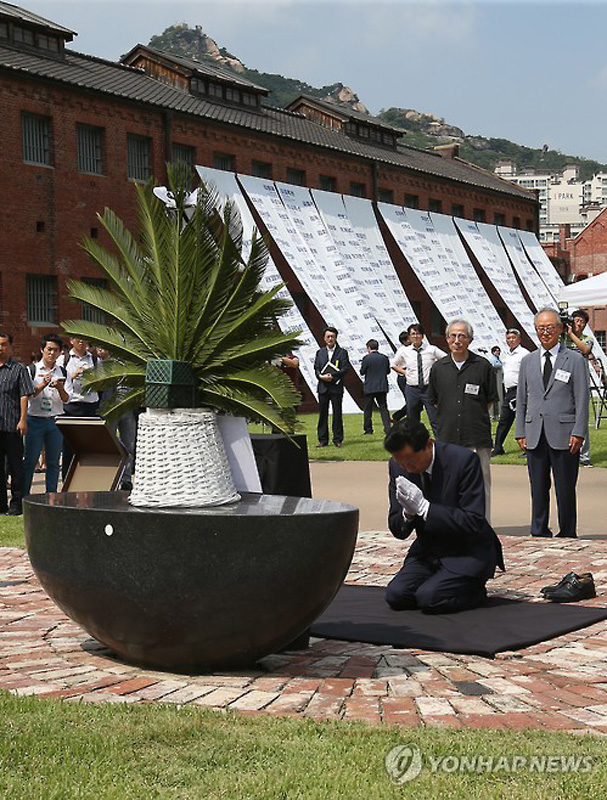 當(dāng)?shù)貢r間2015年8月12日,正在韓國訪問的日本前首相鳩山由紀(jì)夫參觀了首爾“西大門刑務(wù)所”博物館,并在追悼碑前跪地禱告。據(jù)悉,西大門刑務(wù)所始建于1908年,用于關(guān)押反抗日本殖民統(tǒng)治的韓國抗日義士。鳩山由紀(jì)夫表示,日本理應(yīng)承認(rèn)殖民侵略歷史。(圖片來源:網(wǎng)絡(luò))