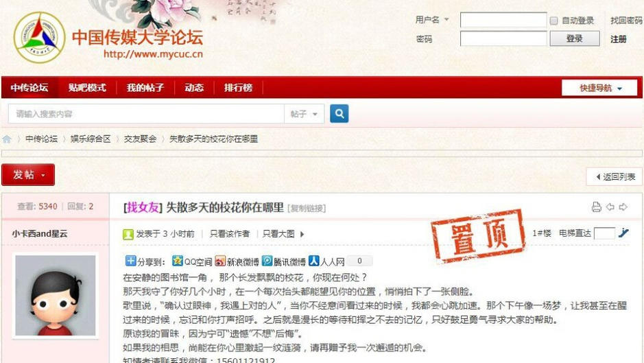 正值開學季,中國傳媒大學驚現癡情男,張貼了數百張海報只為表白?;ǎ瑩掌@示,海報中有女孩側臉照片,還留下男生的聯(lián)絡方式,甚是精細。