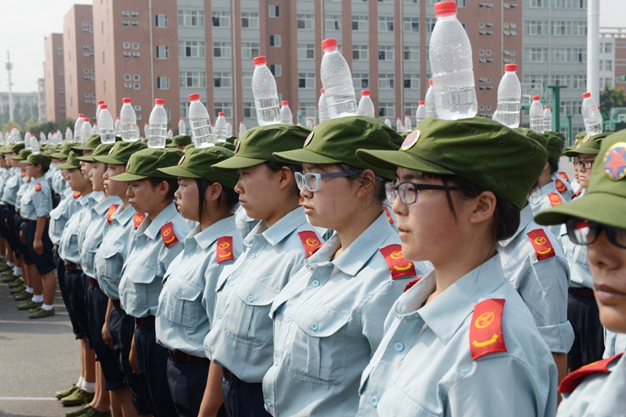 2015年9月17日,河南鄭州航空工業(yè)管理學(xué)院進(jìn)行新生軍訓(xùn),記者軍訓(xùn)現(xiàn)場(chǎng)發(fā)現(xiàn),該院在站軍姿、踢正步等軍訓(xùn)項(xiàng)目上,引入卷尺、純凈水瓶等“裝備”,而且為“準(zhǔn)空姐”訓(xùn)練的科目中,還增加了如何盤發(fā)等項(xiàng)目。圖為2015年9月17日,鄭州航空工業(yè)管理學(xué)院的新生在頭頂?shù)V泉水瓶站軍姿。