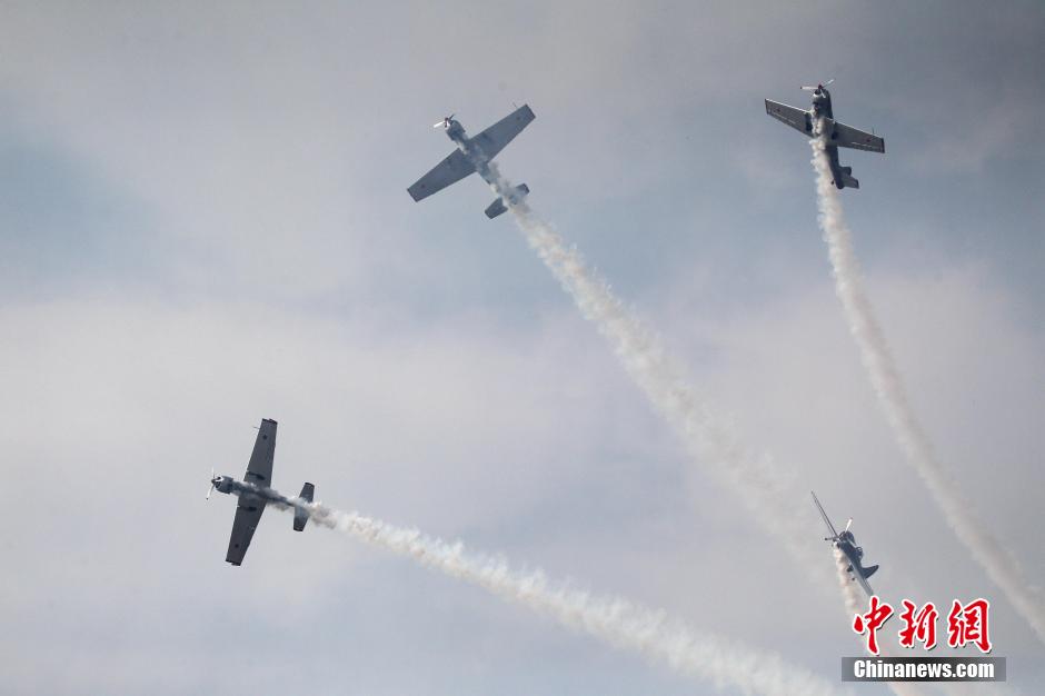 9月24日,河南鄭州上街機(jī)場,參加2015鄭州航展的特技飛行員們,穿云破霧在加緊練習(xí)表演動作,沖刺9月25日開幕的鄭州航展。中新社記者 王中舉 攝