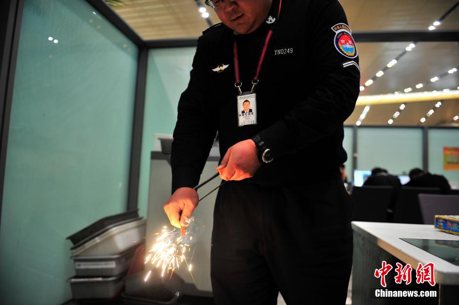 2月5日,昆明長(zhǎng)水國(guó)際機(jī)場(chǎng)安檢站工作人員,向記者展示春運(yùn)開(kāi)始以來(lái)查獲的如皮帶扣打火機(jī)、iPhone造型打火機(jī)、手表打火機(jī)、煙花爆竹、子彈等各種奇葩違禁物品。中新社記者 劉冉陽(yáng) 攝