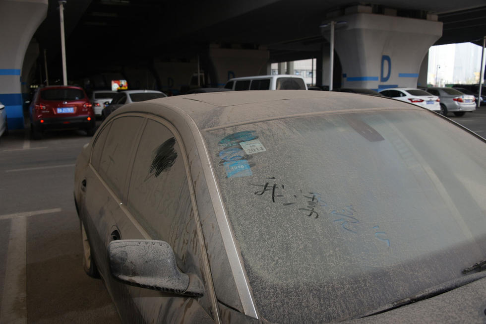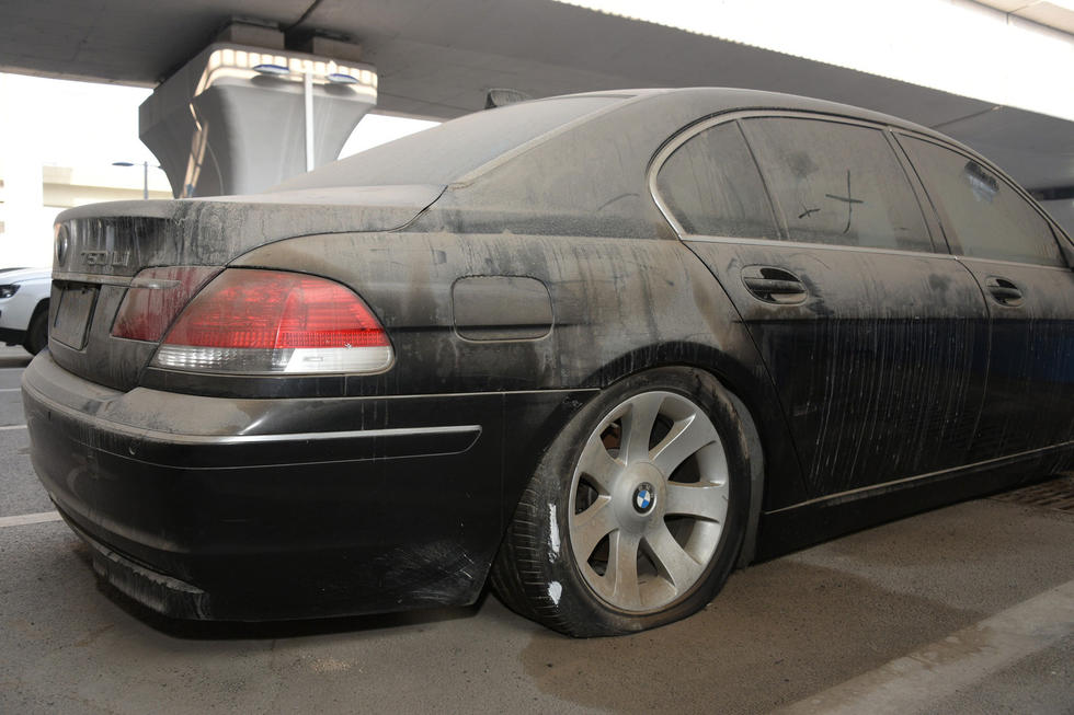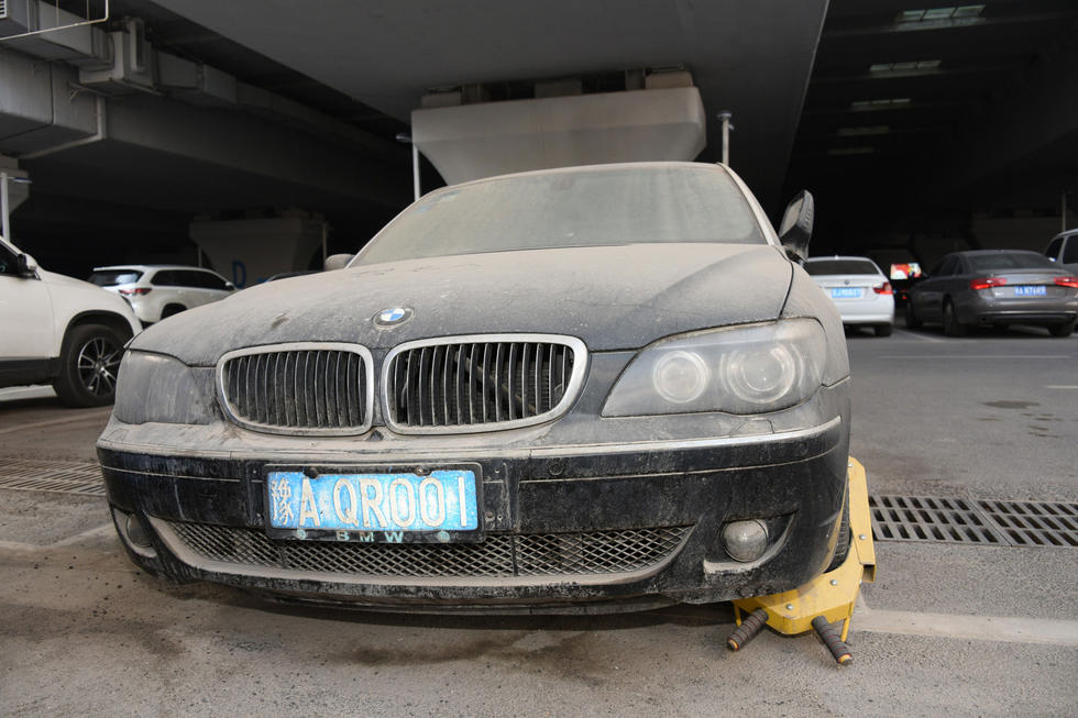 上午7時30分,中興路附近的高鐵站北區(qū)停車場,在入口處東側,這輛“蓬頭垢面”的寶馬車車全身落滿了塵土,已呈灰色。其實,這是一輛價值過百萬的黑色寶馬750LI。該車的右前后輪已經癟了,左前輪被上了鎖。在車后備箱左側上方有一處凹陷,但不太明顯。后引擎蓋上被人寫上“下雨了”字樣。車的縫隙處堆積著厚厚的塵土,顯然,這輛寶馬車已經在此停放已經有很長時間了。