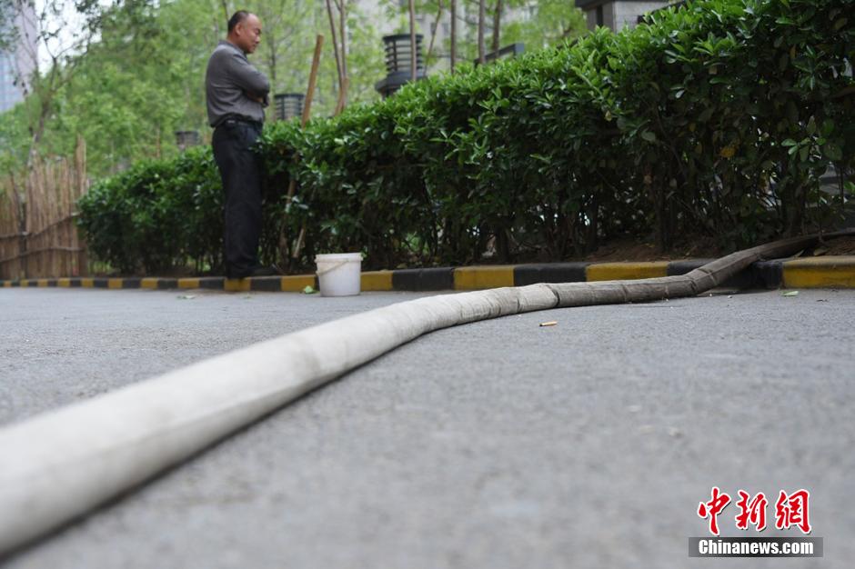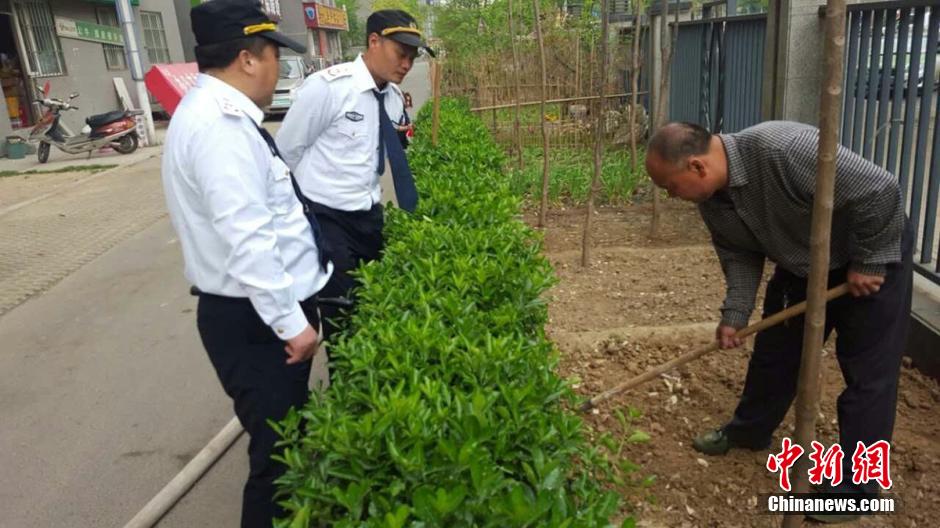 水管是從20樓放下來的,小菜園的主人用它來澆水。”未來路巡防隊(duì)員司廣紅說。在小菜園旁邊站著一名中年男子,手里拿著鐵锨。男子說,他是燕莊村民,姓張,家住9號(hào)樓20層。 李四信 攝 圖片來源:視覺中國