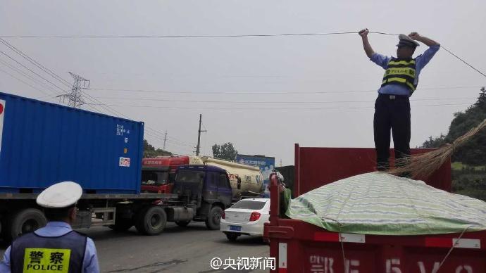 交警董金橋手托線纜。 央視記者 魏軼 圖片來源:央視新聞官方微博