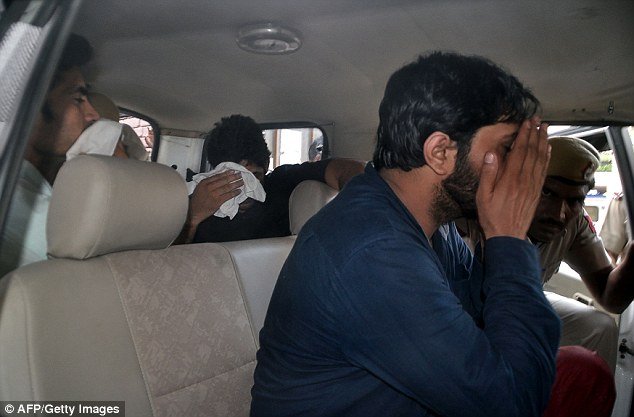 受害女子稱:“我離開學(xué)校,看見了他們,相同的5個(gè)人。我非常害怕?!笔芎θ烁嬖V當(dāng)?shù)匾患译娨暸_(tái),“他們強(qiáng)迫我進(jìn)入車?yán)?,試圖扼死我。他們威脅說要?dú)⑺牢业母赣H和兄弟。”圖為3名涉嫌強(qiáng)奸女子的嫌疑人被捕時(shí),用手遮住臉。