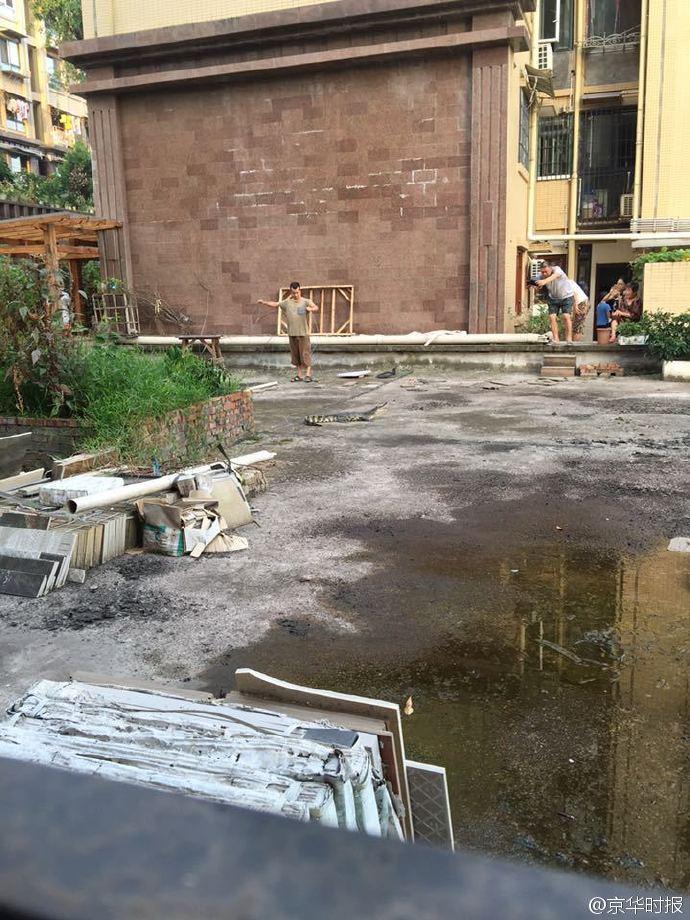 21日,四川省自貢市范女士告訴記者,昨晚樓上鄰居家的鱷魚“跳樓”了,掉進她家一樓的小花園里。
