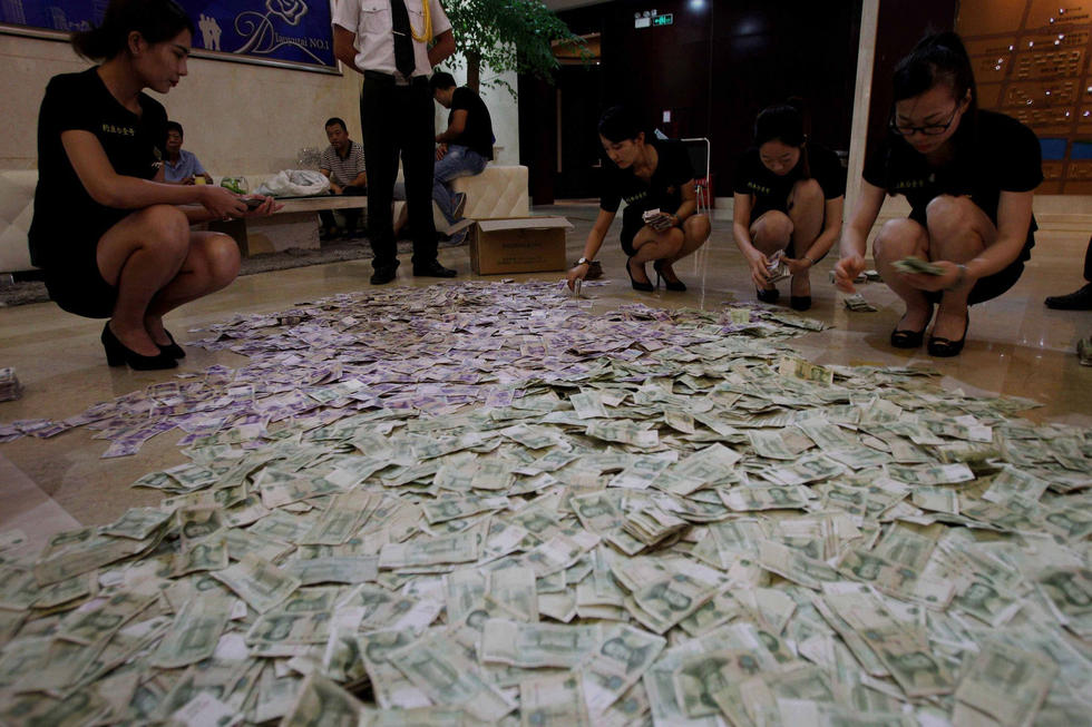 圖為售樓人員數(shù)錢現(xiàn)場。