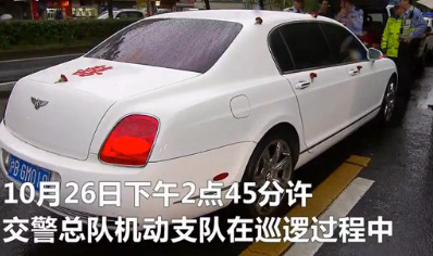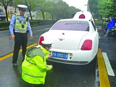 下午2點45分許,上海交警總隊機動支隊巡邏時,在周家嘴路近大連路處發(fā)現一路婚車車隊,共計5輛車,其中領頭的是懸掛“滬BGM018”牌號的白色賓利歐陸跑車。后經查實,此車為套牌車。