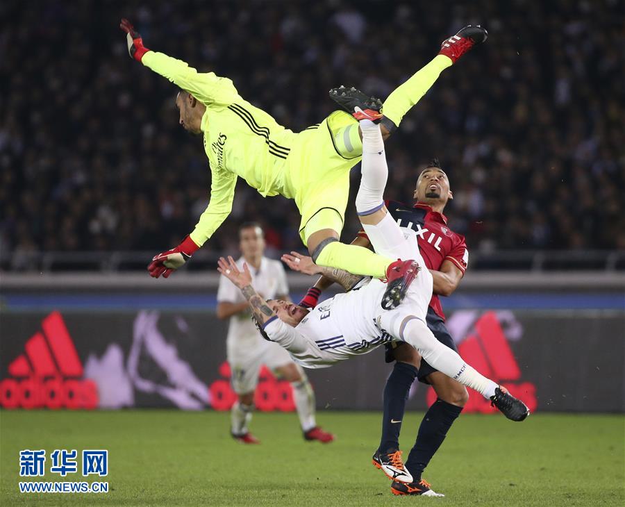 12月18日,皇家馬德里隊(duì)球員拉莫斯(下)、守門員納瓦斯與鹿島鹿角隊(duì)球員法布里西奧拼搶時撞在一起。新華社/美聯(lián)
