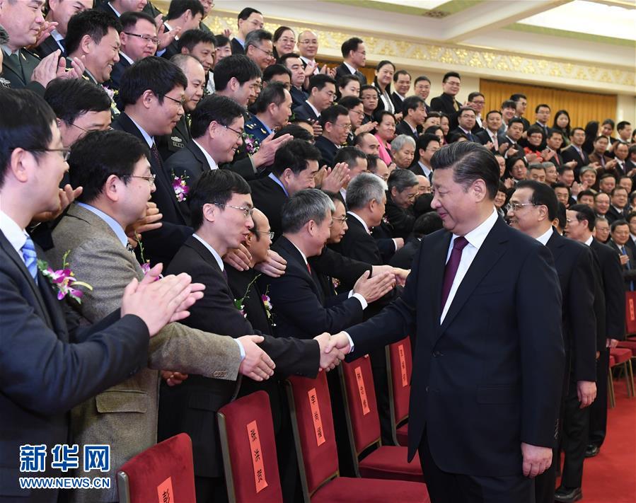 1月9日,2016年度國家科學技術獎勵大會在北京人民大會堂隆重舉行。黨和國家領導人習近平、李克強、劉云山、張高麗等出席大會并為獲獎代表頒發(fā)獎勵證書。會前,習近平等黨和國家領導人會見獲獎代表。新華社記者 李學仁 攝