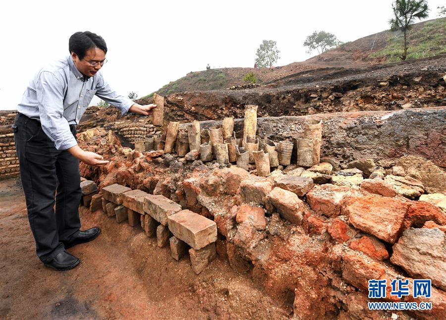 在湖南桂陽桐木嶺礦冶遺址,考古工作者展示用于提煉礦物的坩堝(2016年11月18日攝)。
