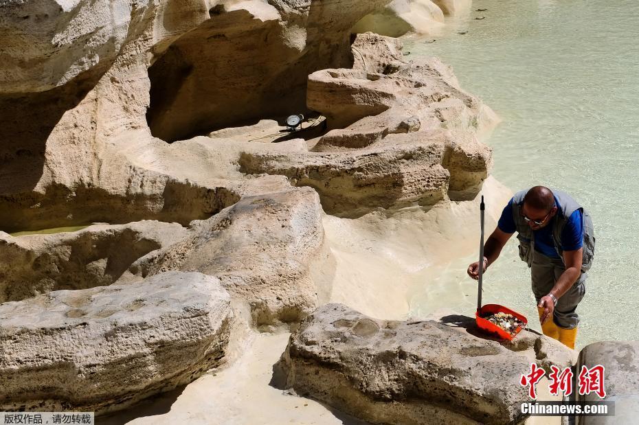 當(dāng)?shù)貢r間2017年5月2日,意大利羅馬,一名工人在特萊維噴泉里收集硬幣。每年從噴泉里收集到的硬幣大約價值100萬歐元。
