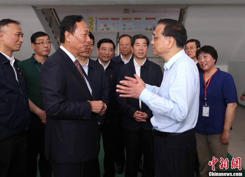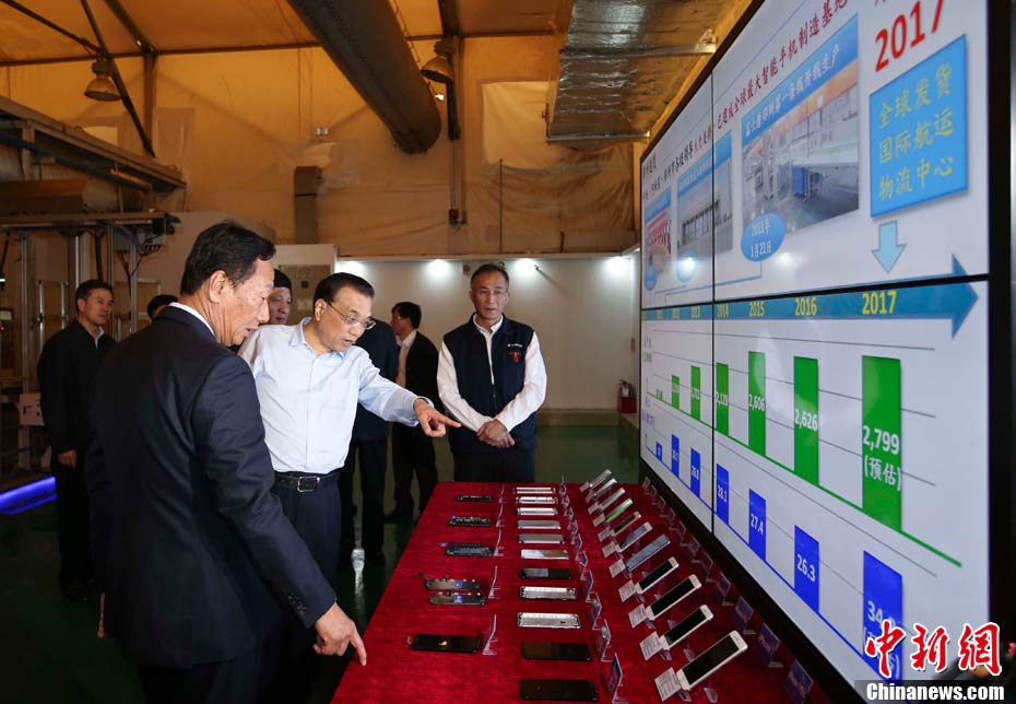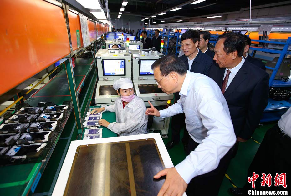 5月8日至9日,中共中央政治局常委、國務(wù)院總理李克強(qiáng)在河南省委書記謝伏瞻、省長(zhǎng)陳潤兒陪同下,在開封、新鄉(xiāng)、鄭州考察。圖為5月9日,李克強(qiáng)考察鄭州富士康科技園。中新社記者 劉震 攝