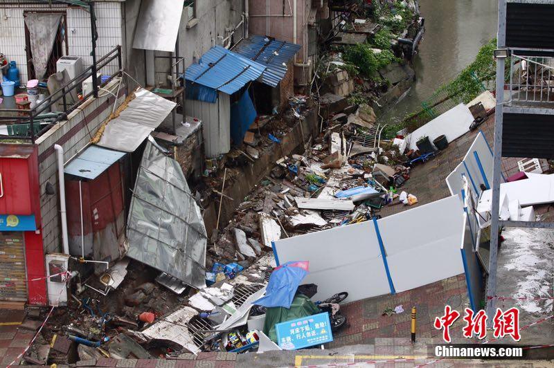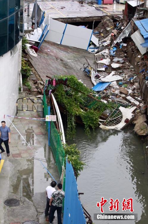 7月18日,深圳普降大暴雨局部特大暴雨,致部分路段嚴(yán)重積水、山體滑坡道路中斷、交通擁堵等險(xiǎn)情。深圳鹽田區(qū)盤山公路恩上路段出現(xiàn)滑坡,無人員、車輛被困;深鹽二通道下沙頭角出口匝道中間因山水傾瀉,道路中斷,交警已經(jīng)實(shí)施了交通管制。當(dāng)?shù)貧庀蟛块T先后發(fā)布了雷電、暴雨黃色、暴雨橙色和暴雨紅色分區(qū)預(yù)警信號(hào)。圖為深圳寶安區(qū)西鄉(xiāng)永安商業(yè)城門前區(qū)域坍塌,長約15米、寬約6米的塌陷。中新社記者 鐘新 攝