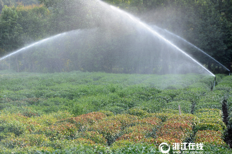 7月27日傍晚,杭州西湖區(qū)雙峰村龍井茶園,全自動噴灌系統在為“曬傷”的茶樹澆水。