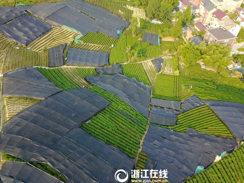 7月27日,俯瞰杭州西湖區(qū)龍塢茶鎮(zhèn),大面積的龍井茶園都撐起了黑色的遮陽棚,以免茶樹被烈日灼傷。