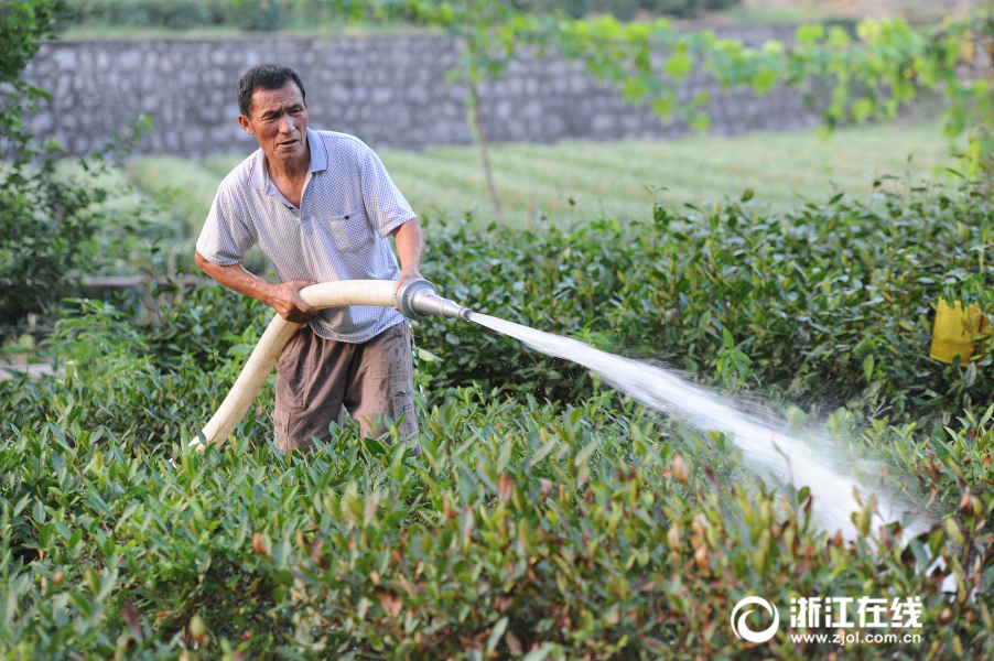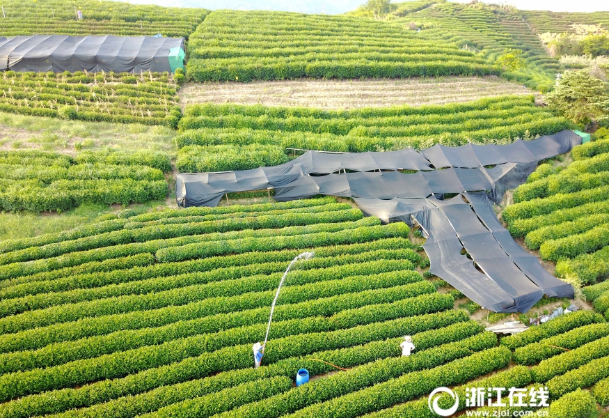 連日來,杭城持續(xù)高溫無雨,西湖龍井茶一級保護區(qū)的梅家塢村、梵村、雙峰村等地茶樹“受傷”不輕。茶農們積極行動起來,為茶樹蓋上防曬網,同時采取澆水的方式抗旱保茶。(浙江在線記者 吳元峰 董旭明 攝)