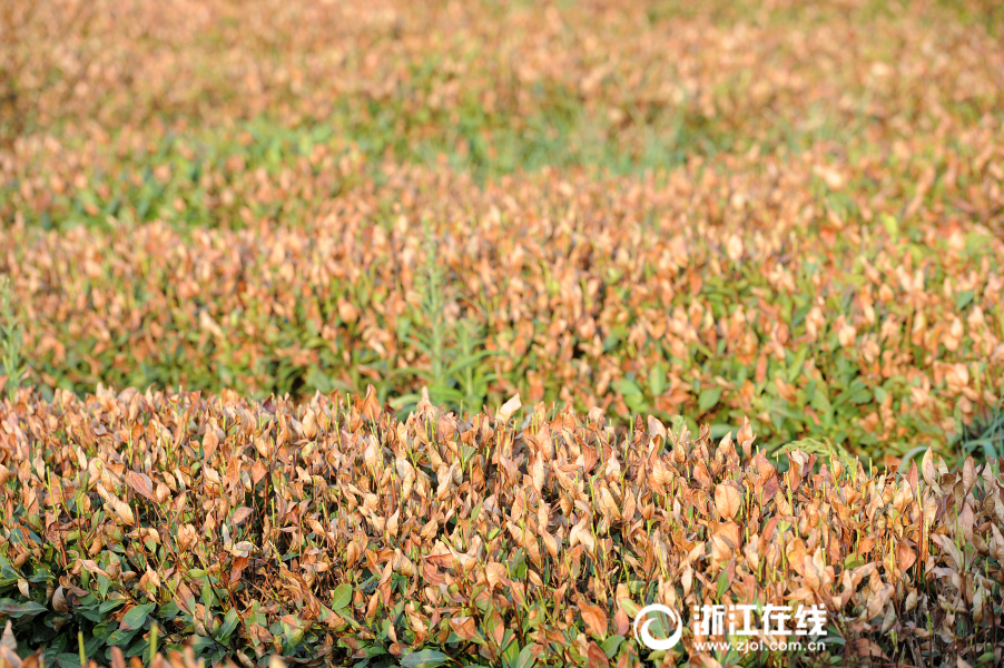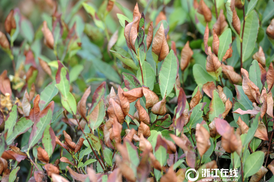 7月27日,熱浪滾滾,杭州西湖區(qū)梵村,龍井茶樹被太陽烤成焦葉狀。