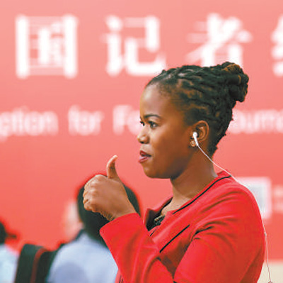 外國(guó)記者在十九大新聞中心進(jìn)行現(xiàn)場(chǎng)連線報(bào)道。 本報(bào)記者 雷 聲攝