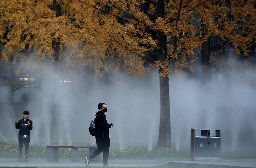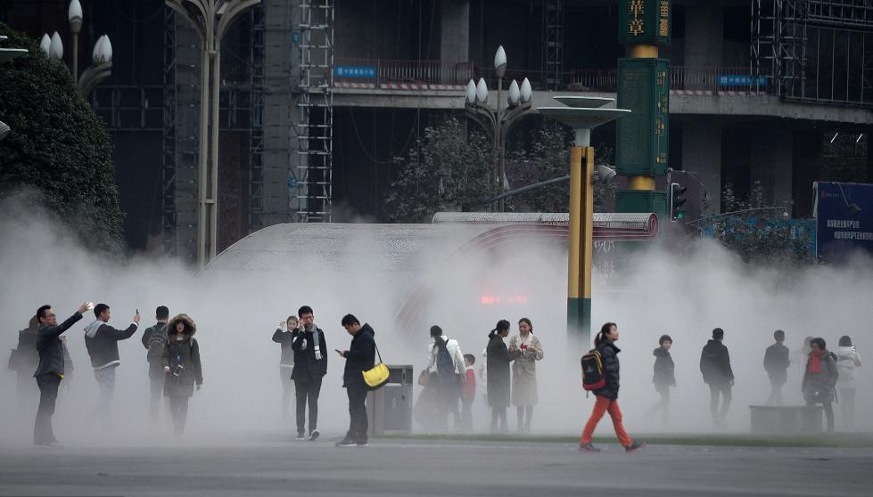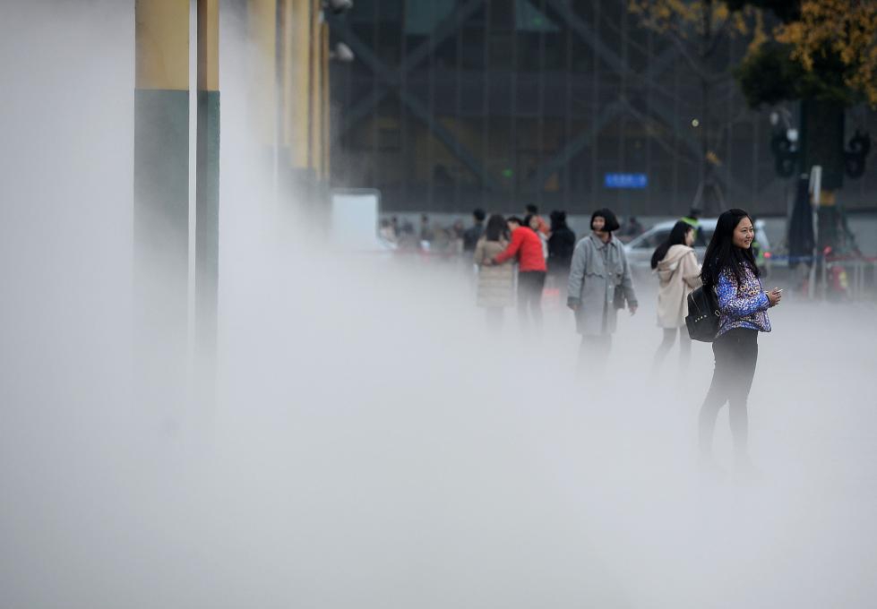 2017年12月23日,成都。天府廣場(chǎng)西側(cè)和南側(cè)有了新變化——上午10點(diǎn),綠油油的草坪上空開始籠罩著層層白色霧氣,仿佛置身于仙境一般。走近一點(diǎn),還有水霧襲來,平添一分清新和涼意。