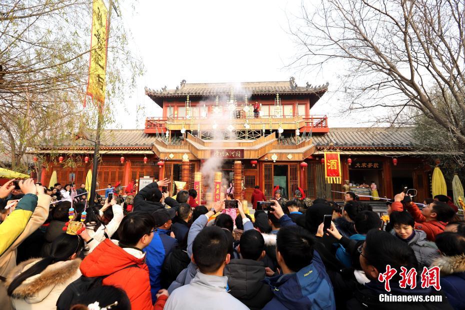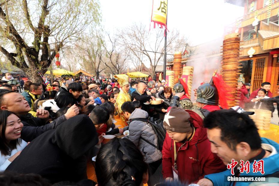 2018年1月1日,河南開封清明上河園孫羊正店門前,現(xiàn)場(chǎng)高高疊起的小籠包熱氣騰騰,小籠包上喜慶的紅字寫著“2018”“蒸蒸日上”。“宋徽宗”帶領(lǐng)“后宮佳麗”為游客免費(fèi)發(fā)放剛剛蒸好的小籠包,寓意新的一年“蒸蒸日上”,吸引數(shù)千名游客爭(zhēng)相品嘗求好運(yùn)。據(jù)清明上河園市場(chǎng)部石經(jīng)理介紹,為了給游客送上這份新年祝福,清明上河園啟用了多個(gè)地方一起蒸小籠包,當(dāng)天共準(zhǔn)備了2018籠開封名吃“灌湯包”,在多個(gè)發(fā)放點(diǎn)陸續(xù)為民眾送上新年的“免費(fèi)午餐”,祝愿大家都能夠在新的一年里“蒸蒸日上”。中新社記者 王中舉 攝