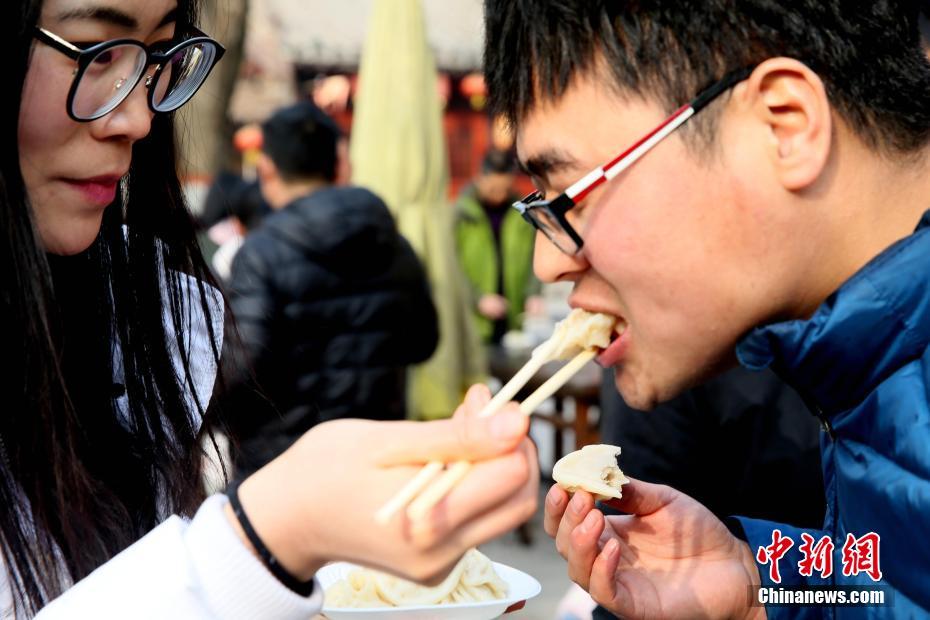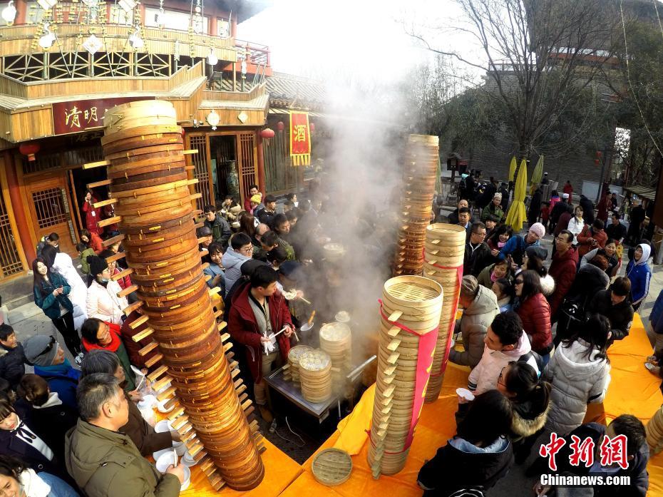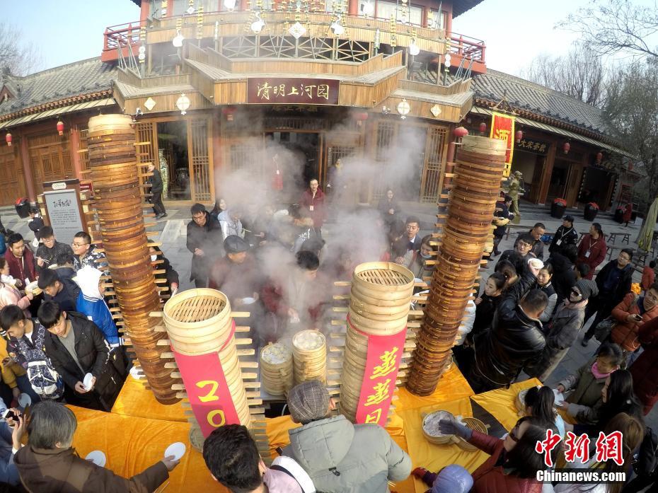 2018年1月1日,河南開封清明上河園孫羊正店門前,現(xiàn)場(chǎng)高高疊起的小籠包熱氣騰騰,小籠包上喜慶的紅字寫著“2018”“蒸蒸日上”?!八位兆凇睅ьI(lǐng)“后宮佳麗”為游客免費(fèi)發(fā)放剛剛蒸好的小籠包,寓意新的一年“蒸蒸日上”,吸引數(shù)千名游客爭(zhēng)相品嘗求好運(yùn)。據(jù)清明上河園市場(chǎng)部石經(jīng)理介紹,為了給游客送上這份新年祝福,清明上河園啟用了多個(gè)地方一起蒸小籠包,當(dāng)天共準(zhǔn)備了2018籠開封名吃“灌湯包”,在多個(gè)發(fā)放點(diǎn)陸續(xù)為民眾送上新年的“免費(fèi)午餐”,祝愿大家都能夠在新的一年里“蒸蒸日上”。中新社記者 王中舉 攝