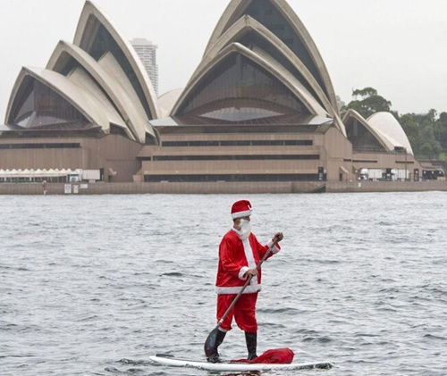 如今圣誕老人出門(mén)不單是靠雪橇了,在澳大利亞,這里高能的圣誕老人可以在劃槳板上表演水上漂來(lái)慶祝圣誕。據(jù)報(bào)道,澳大利亞當(dāng)?shù)貢r(shí)間12月18日,在悉尼港圣誕老人劃槳經(jīng)過(guò)P&O郵輪公司的“太平洋寶石號(hào)”。由于當(dāng)?shù)赜洼喒I(yè)迅速增長(zhǎng),將有6000名澳大利亞人登上P&O郵輪公司的油輪和圣誕老人一起慶祝圣誕節(jié)來(lái)臨。