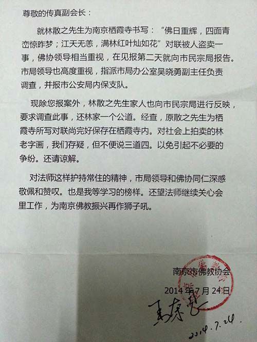7月24日,傳真法師收到一封南京市佛教協(xié)會的回函。回函稱,除了傳真法師報(bào)案外,林散之家人也向市民宗局反映,要求調(diào)查此事,還林家一個公道。