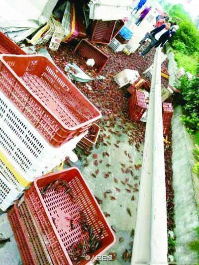 本報訊(記者魏娜 通訊員徐文匯)昨日中午,1輛滿載小龍蝦的貨車在漢宜高速上側(cè)翻,2000余公斤小龍蝦撒了一地。高速公路附近的村民聞訊趕來,拿著蛇皮袋、竹筐搶小龍蝦,車?yán)习寮绷?,攔住這個、跑了那個,手忙腳亂。高速交警和派出所民警及時趕來控制現(xiàn)場,保住大半的小龍蝦。