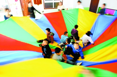 昨天上午10時許,記者來到鄭州康達能力訓(xùn)練中心,未走進教室,已聽到孩子們“嘰嘰喳喳”的叫聲。在其中一教室中看到,100多個可愛的孩子正在進行康復(fù)訓(xùn)練,有的在老師及家長配合下做模式操,有的正在做親子游戲。