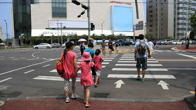 老人過馬路搶燈 被小孫子拽回