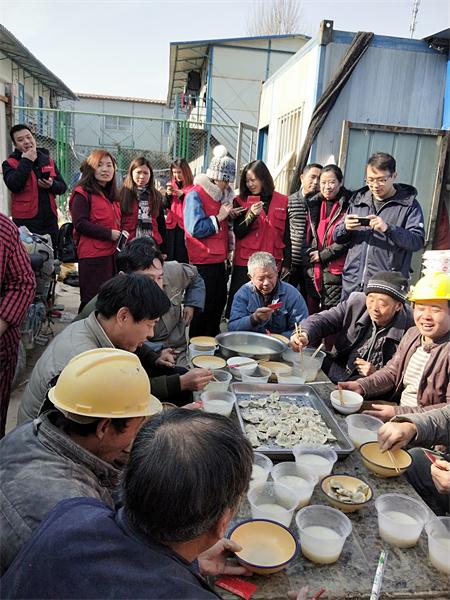 與此同時,第三路名嘴李璇和王澄也在鄭州市北建材附近的工地上行動了起來。他們帶著15名義工來到工地食堂,為民工兄弟們煮起了餃子。餃子出鍋,主持人李璇和王澄和民工兄弟們圍坐在一起,聊著天,品嘗熱騰騰的水餃。在現(xiàn)場,主持人還遇到了一位特殊的老人——劉春娥。劉老太太常年堅持義務給農(nóng)民工送衣服鞋墊,可以說,鄭州工地上的人都認識這位老太太。今天,劉老太太正巧又給這里的工人們帶了40對新納好的鞋墊兒,前不久,老太太才送來了不少衣物。拿著新鞋墊,吃著熱餃子,民工兄弟們個個笑開了花。