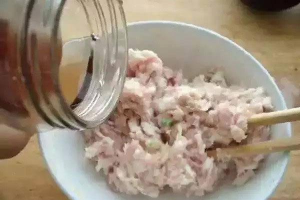 2. 碗里放入豬肉末,鹽,料酒,胡椒粉,蔥末,姜末,少許白菜碎。分次倒入花椒水攪打上勁。