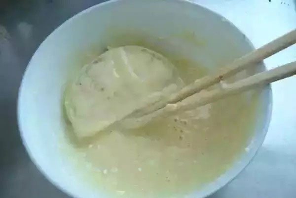 7. 面粉里放入雞蛋,鹽,不要加水,拌勻。茄團掛糊。