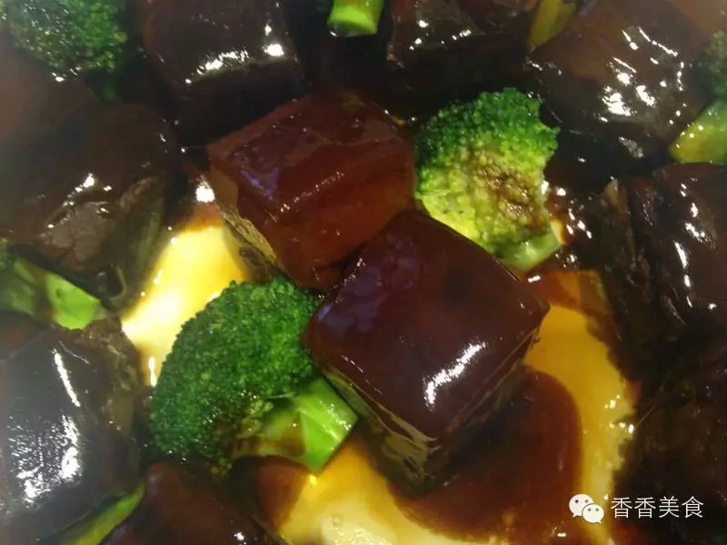 3、鍋內(nèi)放油,加入白糖炒糖色,然后加入水,冰糖,生抽,老抽,將炒好的料汁倒在肉上,上火煨制30分鐘即可。