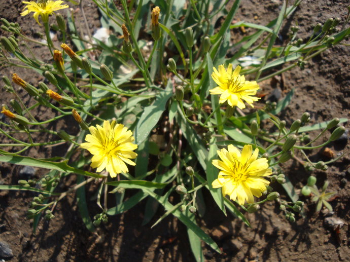 原生形態(tài):抱莖苦荬菜多年生草本,高可達(dá)1米許。根粗壯而垂直。莖直立。根生葉排成蓮座狀,葉片長(zhǎng)圓狀倒披針形,倒向羽裂狀或羽狀缺刻,先端短尖或鈍圓,基部慚狹成柄,花期通常不萎落;莖生葉基部抱莖。頭狀花序排成傘房狀;總苞圓摘狀,外層苞片極短小,內(nèi)層苞片線(xiàn)狀披針形;花黃色,全部為舌狀花,先端5齒裂;花柱細(xì)長(zhǎng),柱頭2裂,冠毛白色,一層。瘦果紡錘形,稍扁,果喙長(zhǎng)約為瘦果的1/4,通常與瘦果不同色?;ㄆ诖杭?。生于山腳、路邊、疏林內(nèi)、河邊。