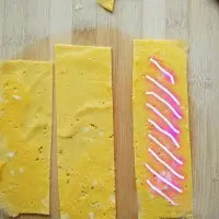 1. 雞蛋打散加少許鹽,淀粉加少許水調(diào)勻,加在蛋液中攪拌均勻,平底鍋小火,倒入蛋液,煎成薄薄的蛋皮,切成寬約4厘米的長(zhǎng)條。