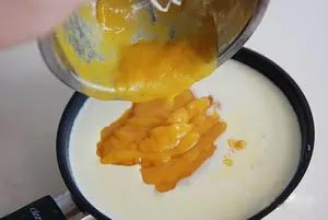 1、蛋黃、細(xì)砂糖、牛奶全部倒入小鍋中,并攪拌均勻。